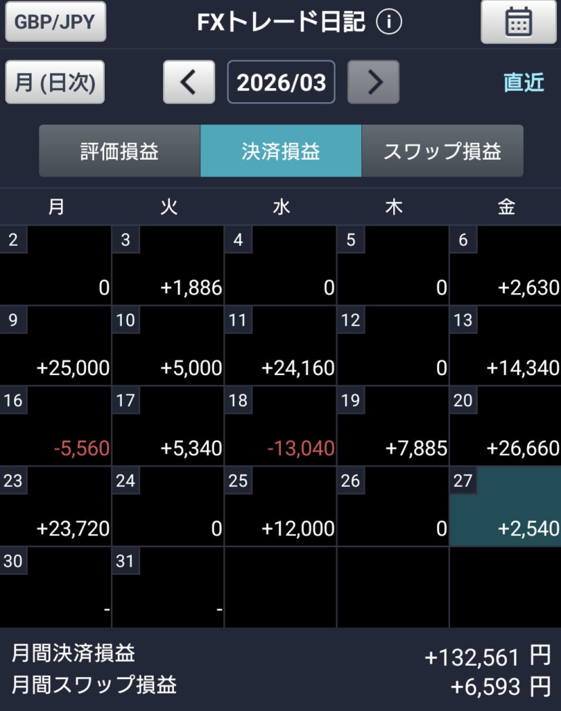 FXネオ GBP/JPY スイングトレード 2026年3月4週 2026年3月28日 最終更新日時 : 2026年3月28日 admin 今週は4万円弱の儲けでした。 今週は特に木曜日とかあまり動かない日が多かった。 金曜日は1万円以上儲けてたけど調子に乗り過ぎて行ってこいしてしまい、やや儲けに終わる。